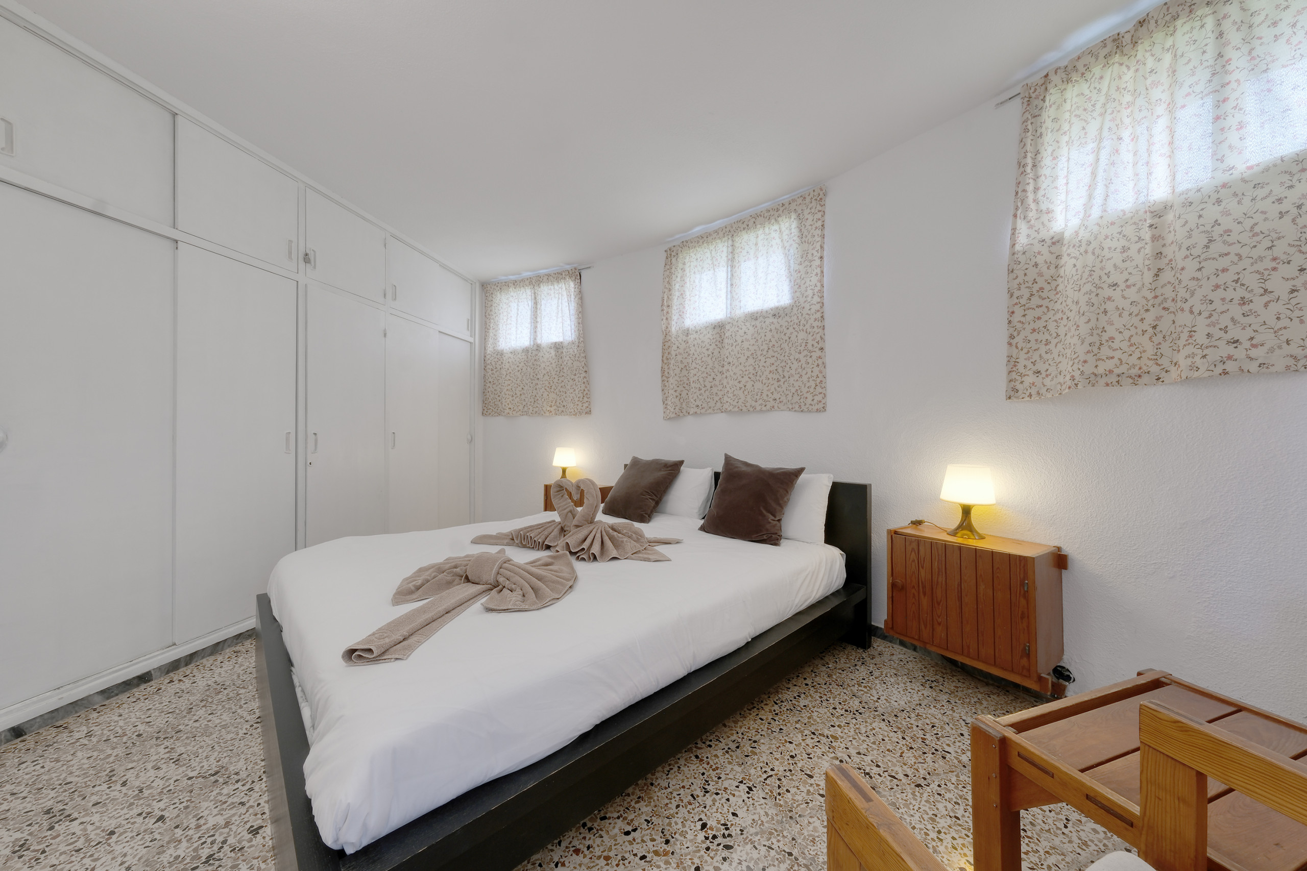 La vivienda cuenta con dos habitaciones cuidadosamente decoradas, pensadas para garantizar descanso y tranquilidad. Una habitación dispone de cama doble y la otra cuenta con dos camas individuales. Ambas ofrecen espacios luminosos y funcionales con armarios y una decoración actual que combina comodidad y sencillez.