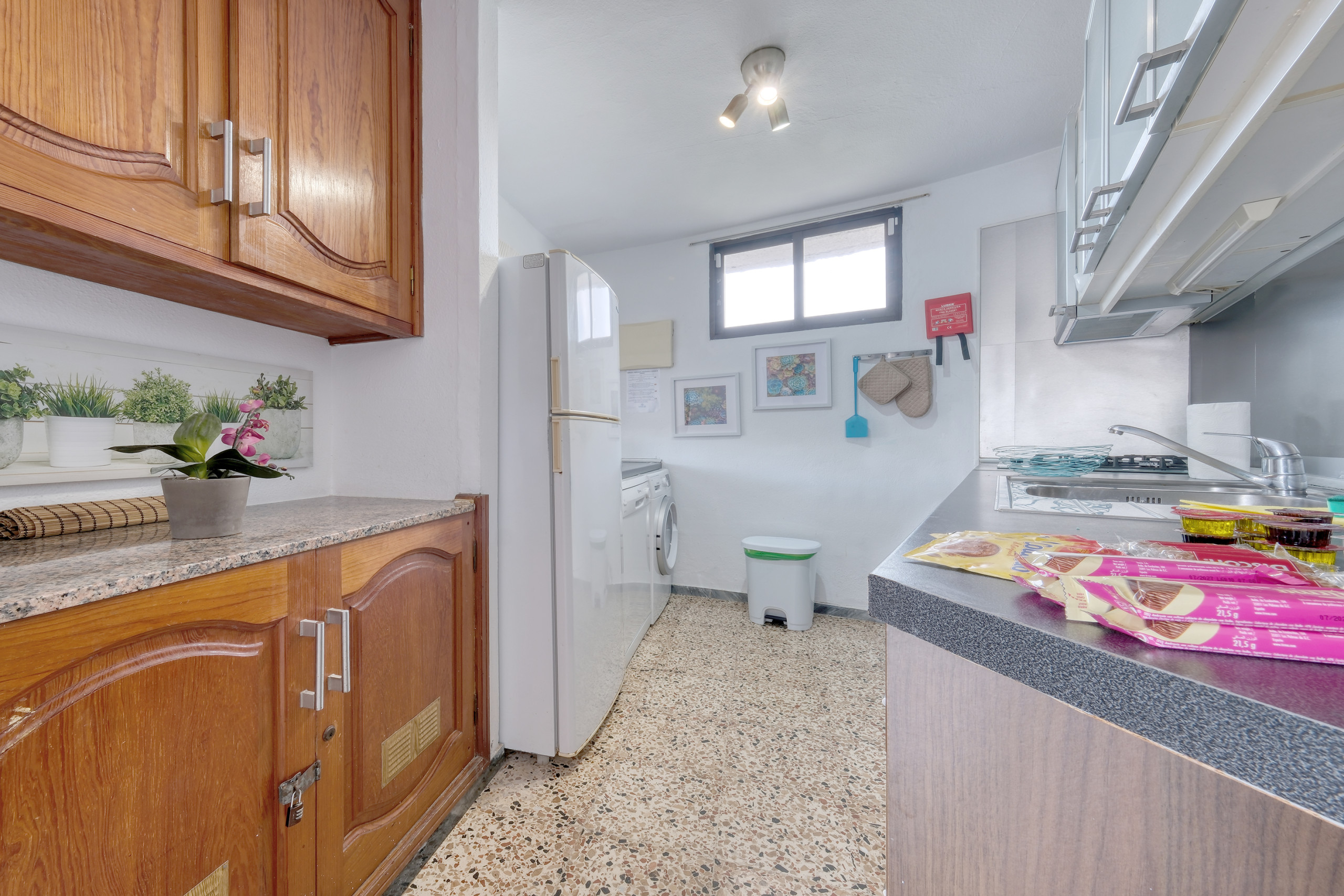 La cocina independiente, totalmente reformada, está completamente equipada con electrodomésticos y pequeño menaje para una estancia cómoda y práctica, incluyendo horno, microondas, nevera, cafetera, tostadora, hervidor de agua y todo lo necesario para disfrutar del alojamiento con total autonomía.