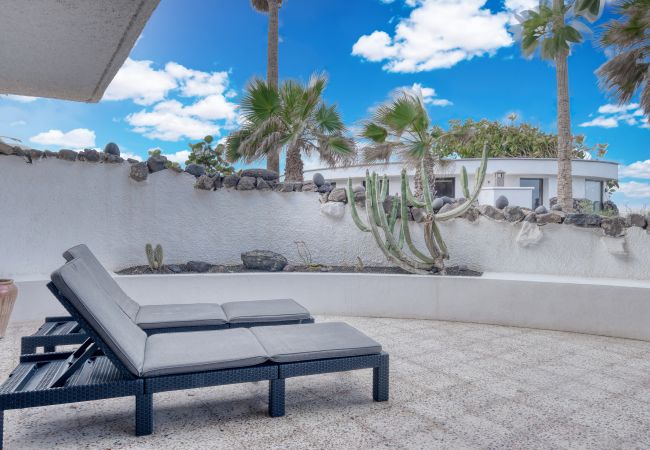 El bungalow dispone de un luminoso salón con zona de estar y comedor, diseñado para ofrecer confort y funcionalidad en un ambiente moderno y acogedor. Sus amplios ventanales permiten una agradable entrada de luz natural y conectan directamente con la terraza exterior con vistas al océano, creando un espacio ideal para relajarse después de un día de playa.