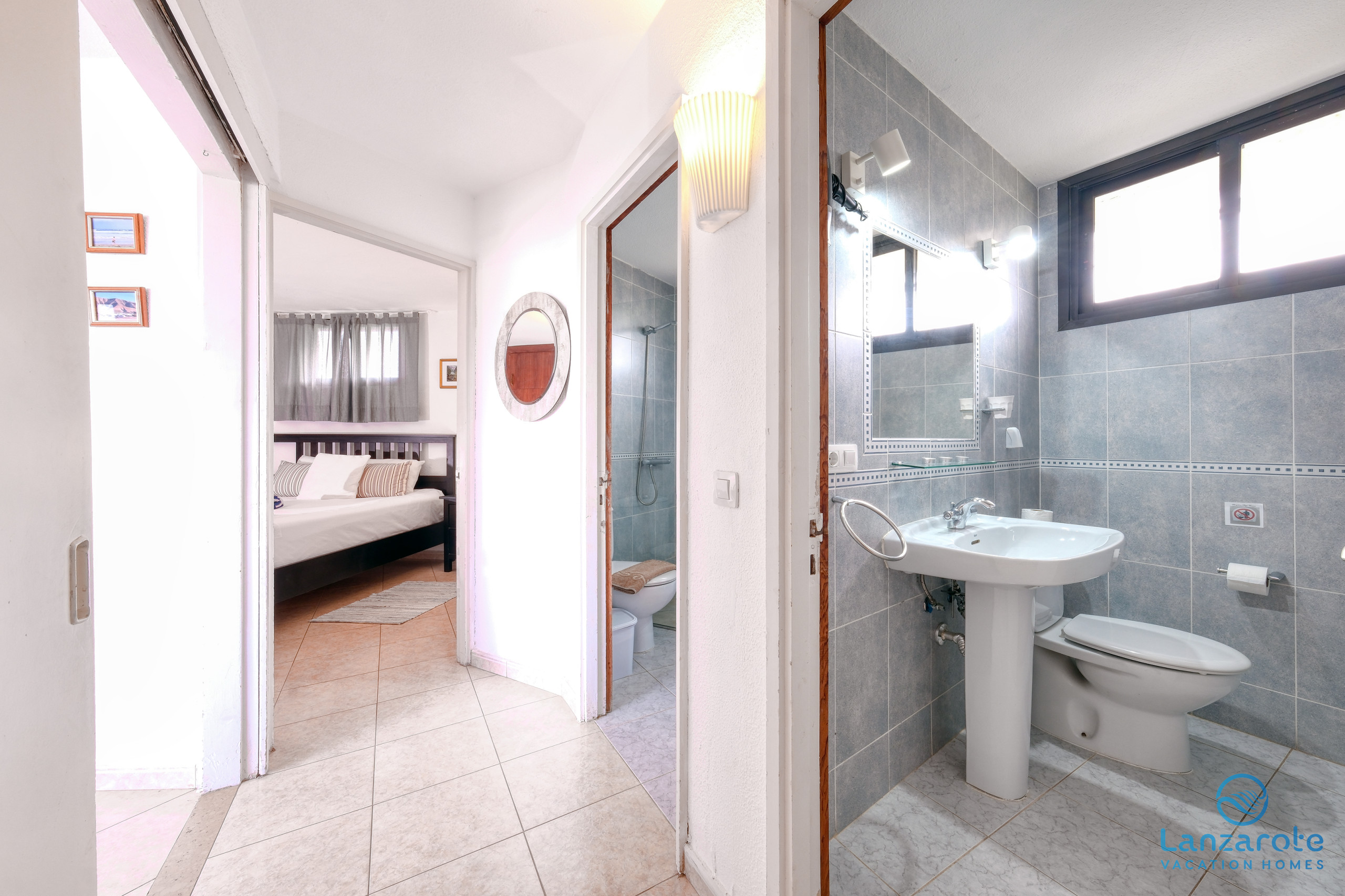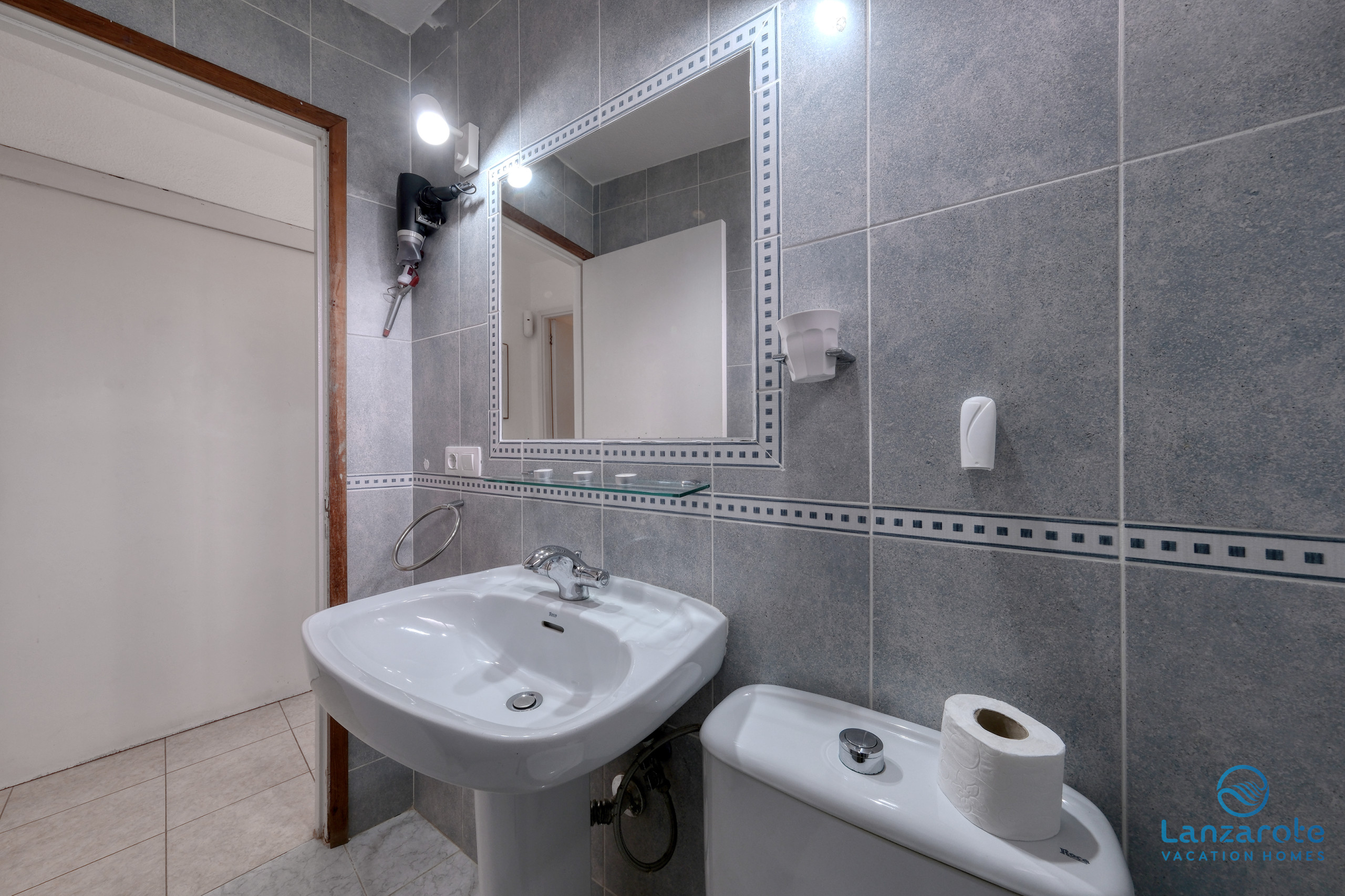 El baño está distribuido en dos espacios independientes, aportando mayor comodidad durante la estancia. Un espacio cuenta con ducha, lavabo y WC, mientras que el segundo incluye WC y un lavabo adicional, permitiendo un uso simultáneo y ofreciendo más funcionalidad para familias o grupos.