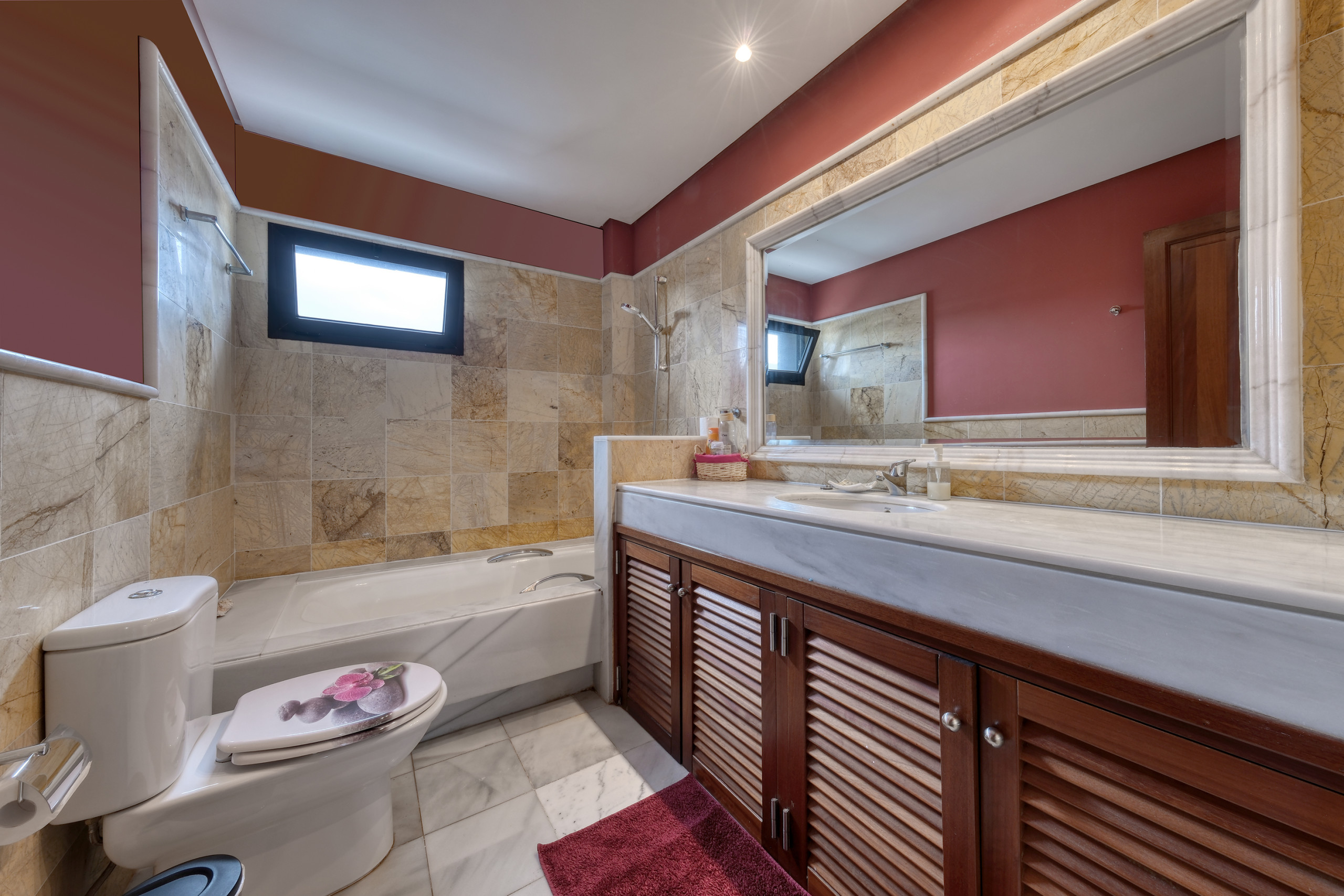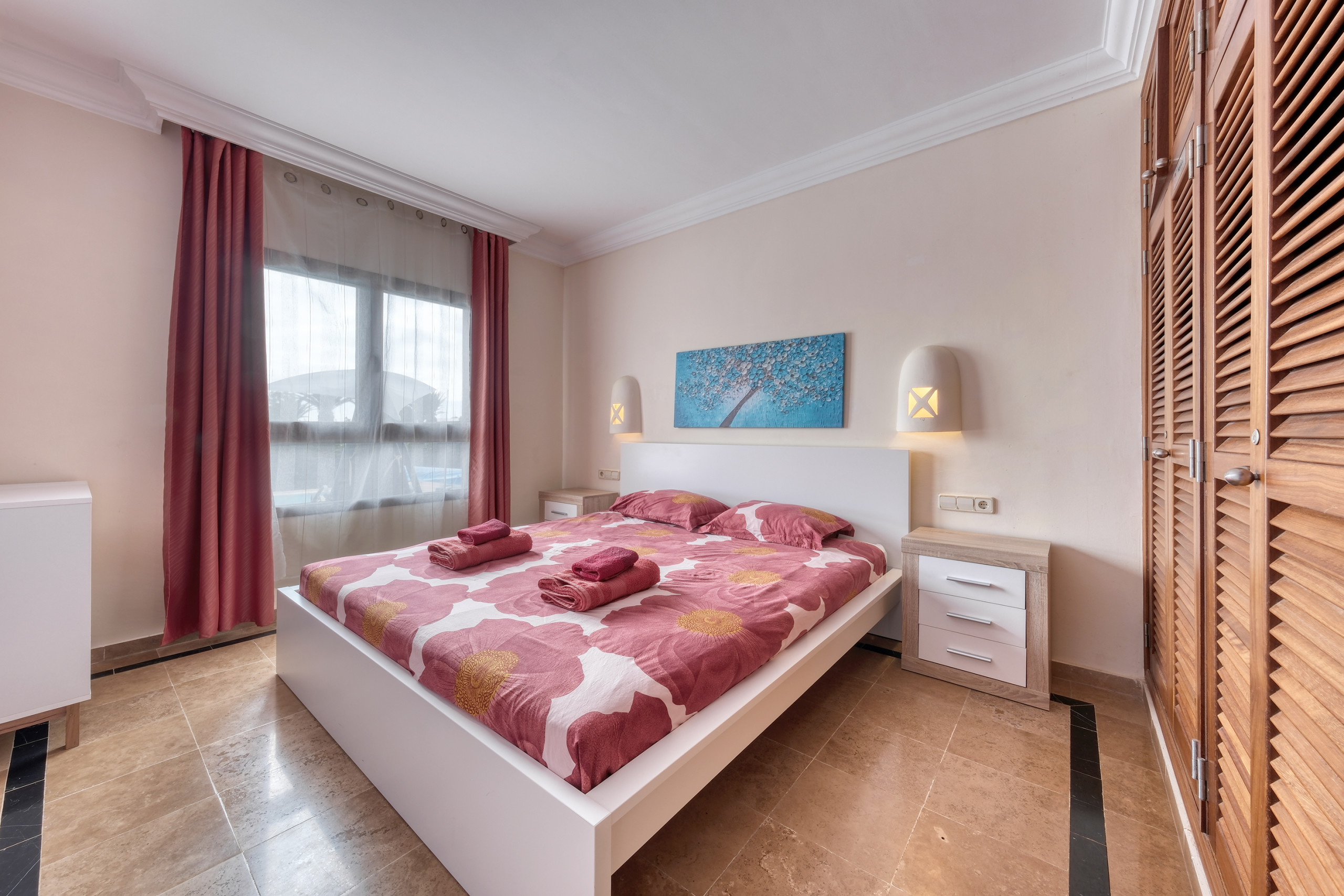La villa dispone de dos acogedores dormitorios con camas de matrimonio y armarios empotrados. El dormitorio principal cuenta con baño privado en suite y acceso directo a una agradable terraza privada, perfecta para disfrutar de momentos de tranquilidad al aire libre. El segundo dormitorio se encuentra junto a un baño completo independiente con plato de ducha y secador de pelo.