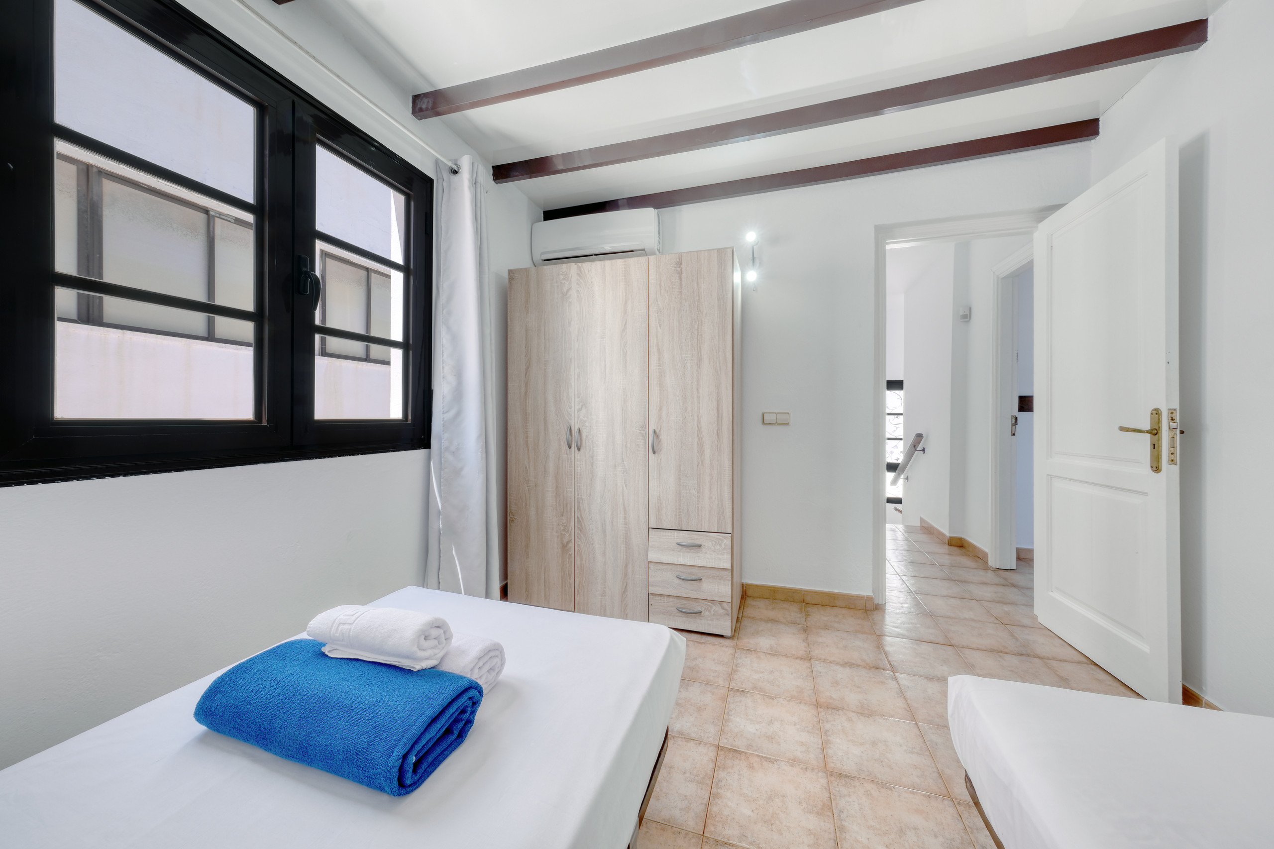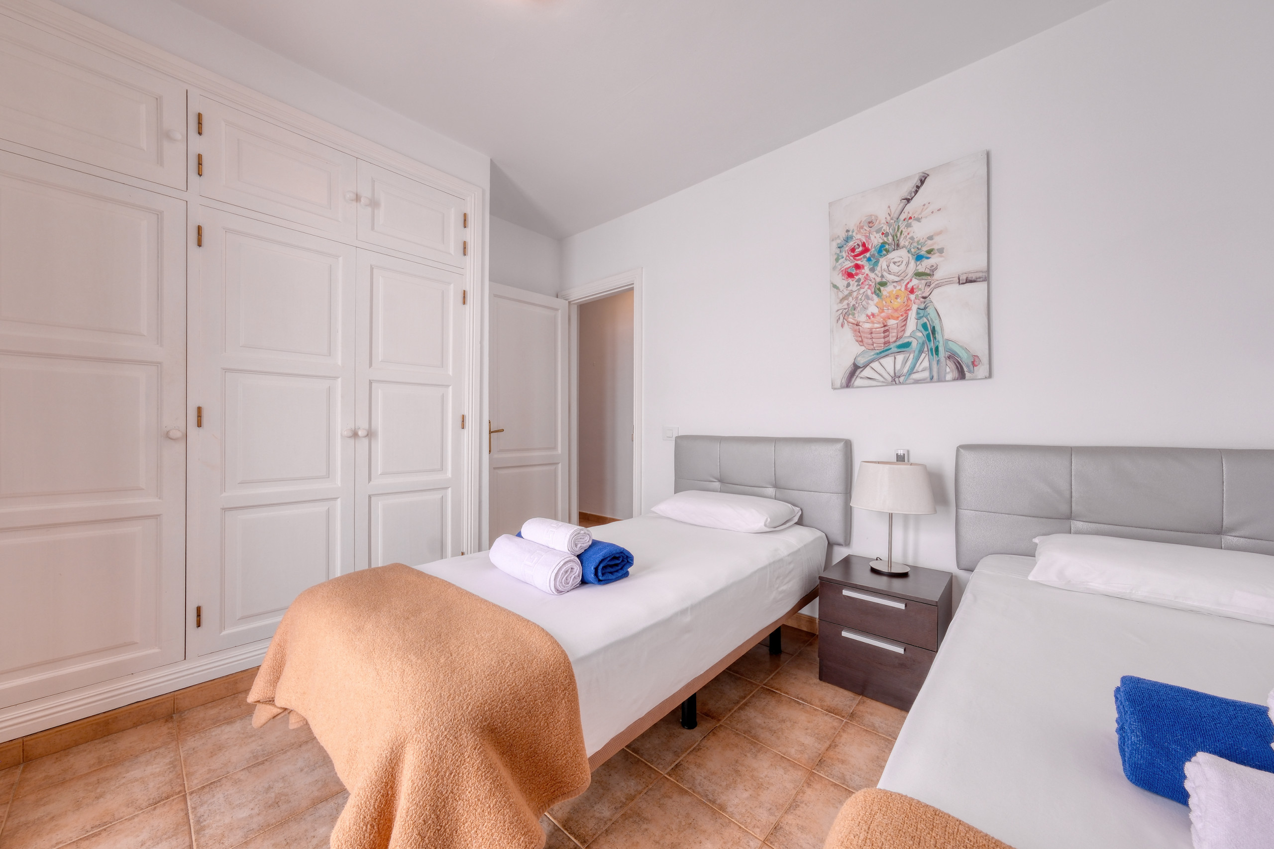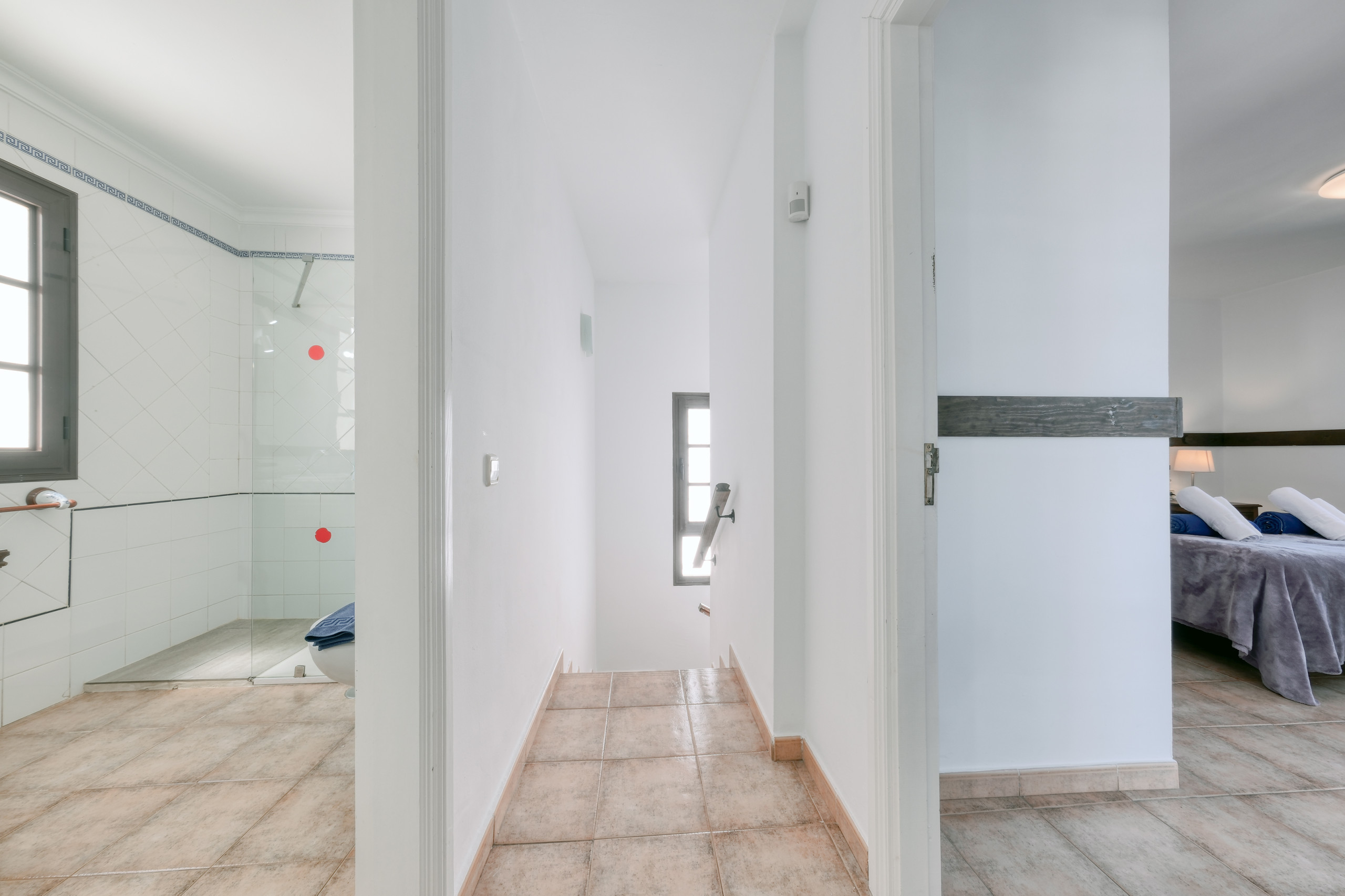 Villa El Rincón dispone de tres dormitorios cuidadosamente decorados, dos con camas individuales y una habitación principal con cama de matrimonio. La vivienda cuenta además con dos baños completos con ducha y secador de pelo, pensados para el máximo confort de todos los huéspedes.