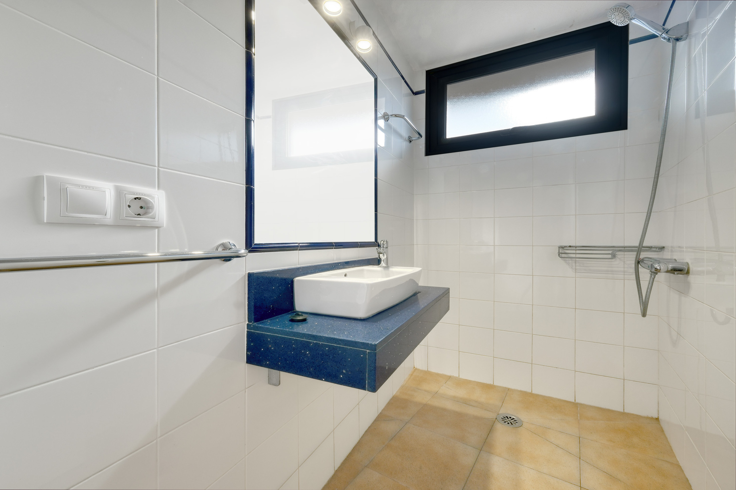 The bathroom is intelligently distributed in two independent rooms for greater comfort. One area has a shower and washbasin, while the second has a WC and an additional washbasin, facilitating simultaneous use and providing greater functionality during the stay.