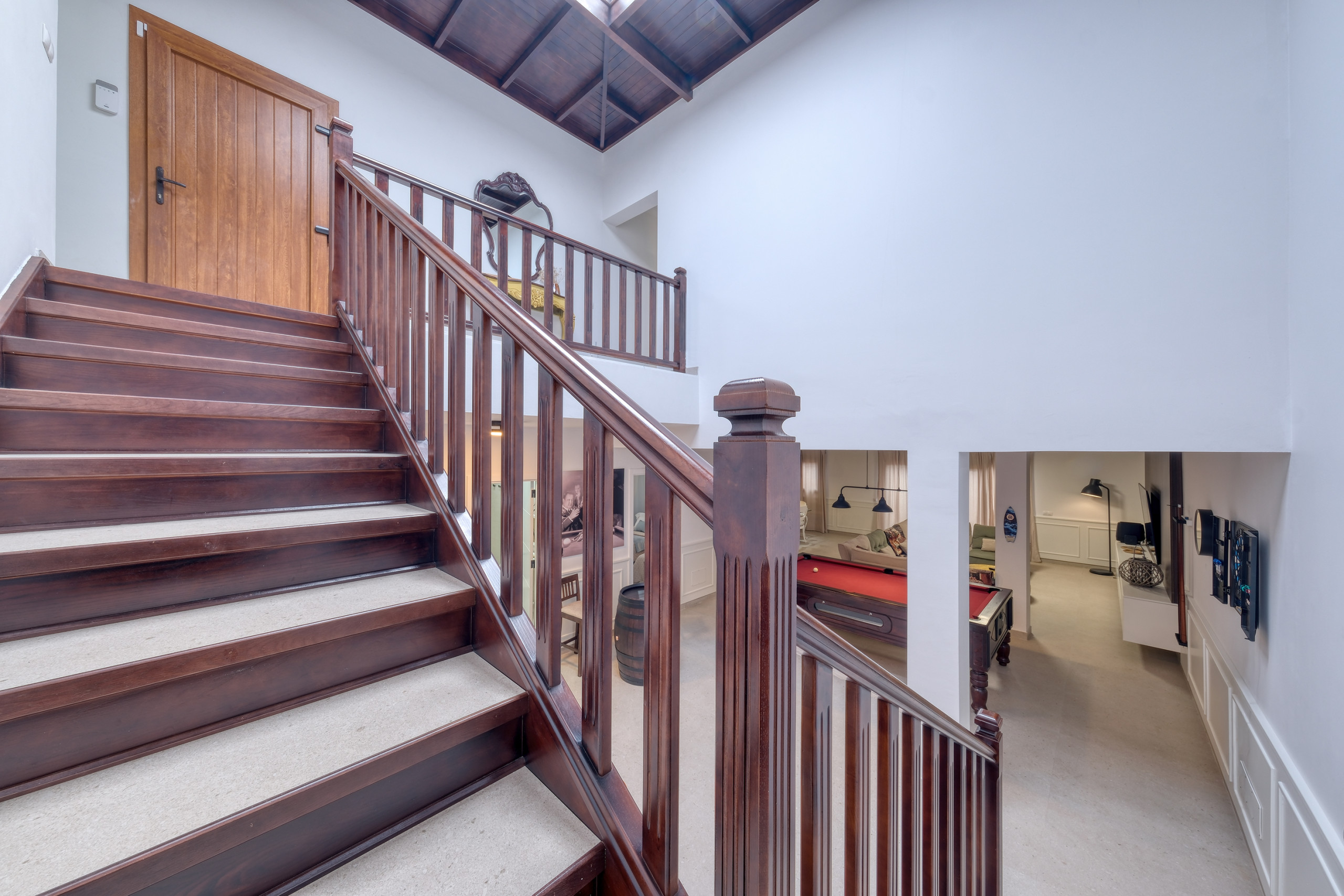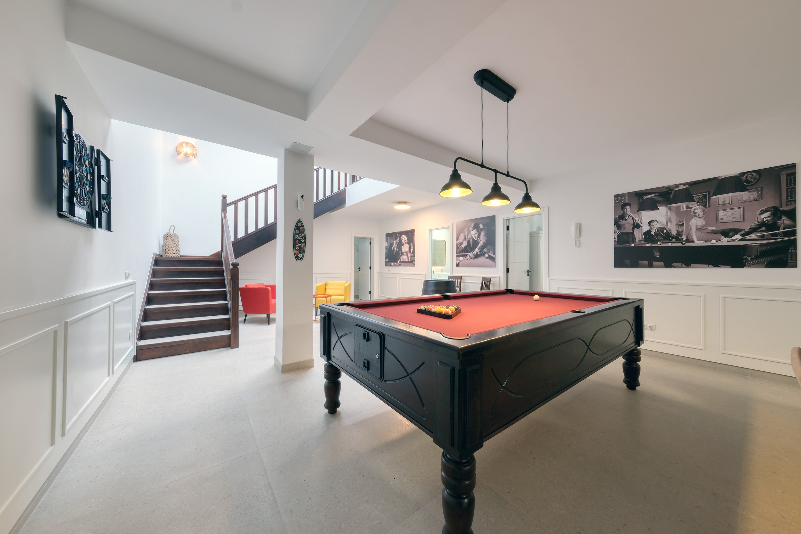 The lower floor is designed for leisure and rest. It has a second living room with a billiards table, a spacious sofa, and a flat-screen television with international channels. Here, there are also two bedrooms with two single beds each, one of them with direct access to a private terrace, as well as an additional bathroom with a shower tray.