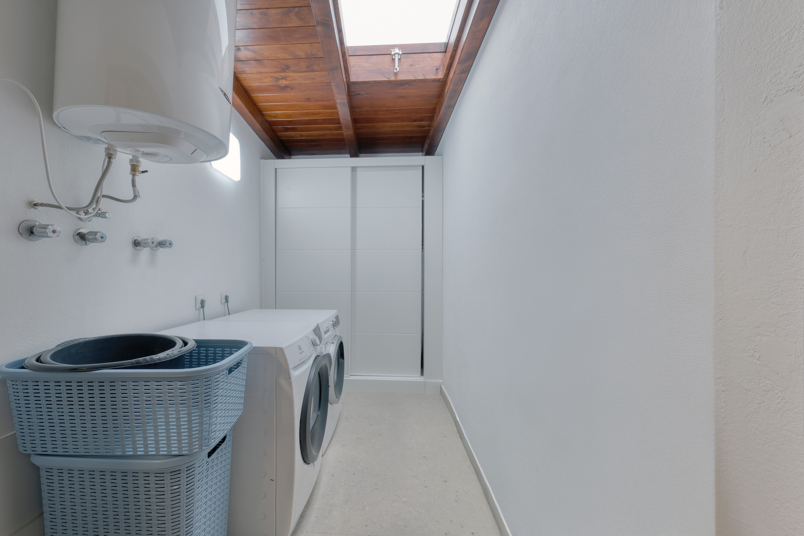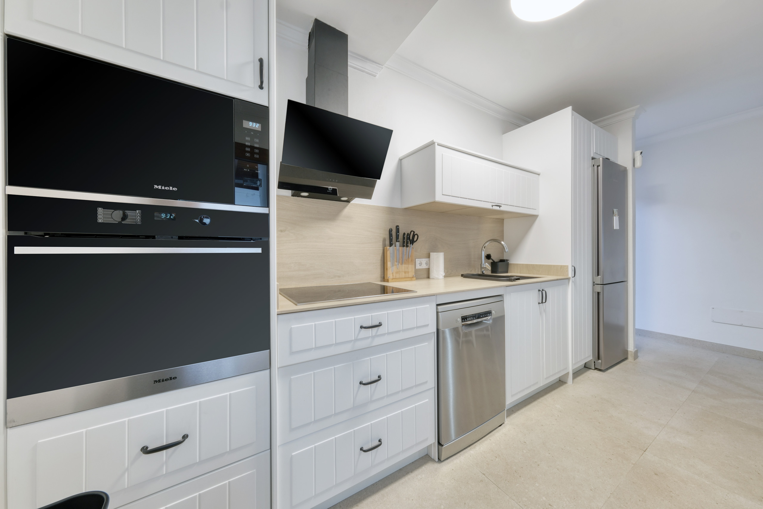 The upper floor houses an elegant and bright living room with a flat-screen television and international channels, which opens onto a spacious terrace with ocean views. The American kitchen, with a modern design and open concept, is fully equipped with high-quality appliances: dishwasher, oven, microwave, refrigerator, coffee maker, toaster, kettle, and complete kitchenware, offering everything necessary for a comfortable and sophisticated stay.