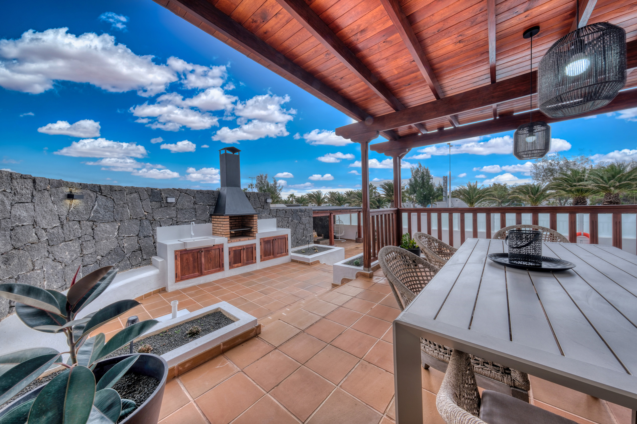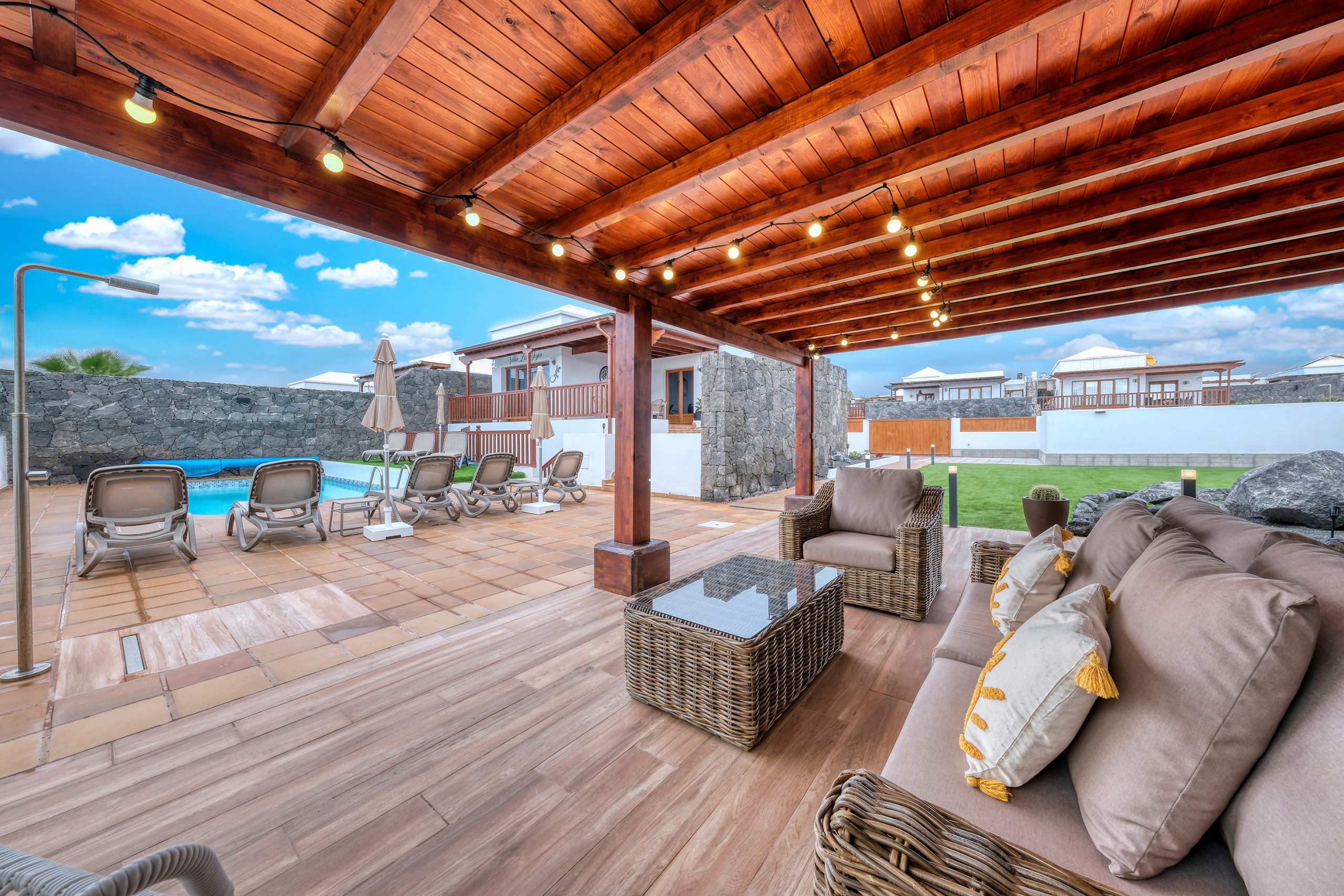 The exterior of Villa Los Yeyos is a true private oasis. Its large heated swimming pool, the barbecue area with an outdoor dining area, and the chill-out space with comfortable sofas invite you to enjoy Lanzarote's climate in an exclusive atmosphere. The property also has direct pedestrian access to the seafront promenade.